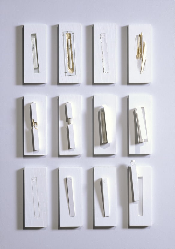 The Jewish Museum commissioned Allan Wexler to create a suite of twelve mezuzot which are installed throughout the building. On display here is a second set that the artist created for the Museum's collection. Using a pure white background as a constant element, Wexler created a series of variations as he explored a number of themes-how to display the klaf (scroll), how much (or little) text to reveal-and posed metaphorical questions related to the mezuzah's placement at an architectural threshold.