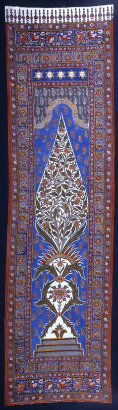 The composition of this cotton textile is based on that of rugs. The guard stripes are filled with flowering vines; the horizontal panels at top and bottom bear parrots alternating with carnations and other flowers on an indigo ground. At top are paisley leaf finials. At center is the outline of an arch similar to the mihrab on prayer rugs and an image of a tree inhabited by birds.
