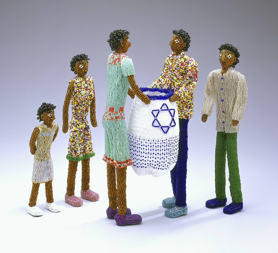 This piece represents an interpretation of tzedakah (charity) by a non-Jewish artist in South Africa. Jeremiah Maloi works with Monkeybiz, an organization that strives to empower disadvantaged people by providing them with materials to create art.