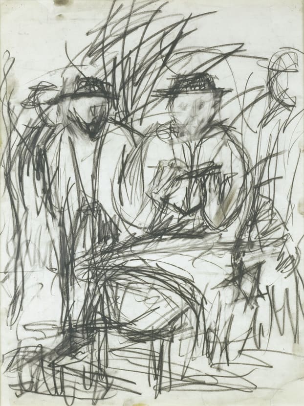 Larry Rivers often included autobiographical references in his work, as in these sketches of mourners at his grandmother's funeral. Loosely based on nineteenth-century French painter Gustave Courbet's Burial at Ornans, in which the grave itself is at the front of the composition, the drawings transform the art-historical reference with a highly personal rumination on family and death.