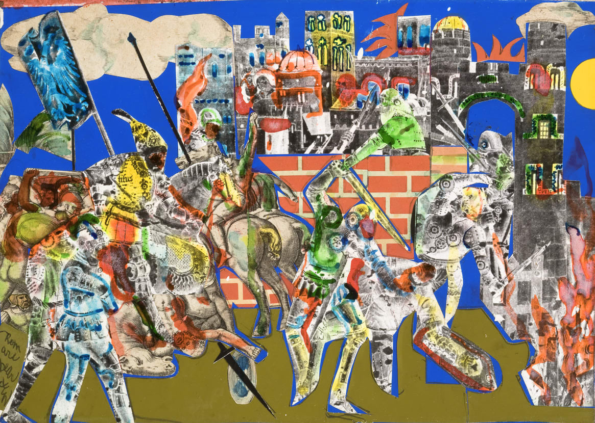 One of the most popular and enduring Negro spirituals is "Joshua Fit de Battle ob Jericho," in which Joshua brings down the walls of the city of Jericho with only a sword and the power of God. In this painting, Romare Bearden, one of the preeminent twentieth-century African American artists, depicts the battle that captured the spirit of freedom that is a part of the fabric of African American life. Throughout his career, Bearden’s art portrayed the lifestyle of Black America, from street musicians to Sunday church. His interest in what he called "the prevalence of ritual" led him to explore numerous Biblical themes. He repeated the Jericho theme several times, including Sermons: The Walls Came Tumbling Down, 1964, and Reverend John’s Sermon, No. 1, 1973.