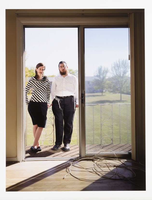 City of Destiny (Schneur and Ester) shows nineteen- year- old Orthodox newlyweds in their new home. Each one is the child of a rabbi who came to the town to revive their religion among recent Jewish immigrants from the former Soviet Union. Although the couple’s marriage was not exactly arranged, in their close- knit, insular community, Ester and Schneur were matched up as they were the only two people of marrying age who suited each other. The composition suggests a modern, wry consideration of such a tradition: within one frame of the window, the couple stands on the porch beside the rigid parallel lines of its railing. This symmetrical and ordered arrangement, however, is offset by the wires chaotically strewn in the foreground.