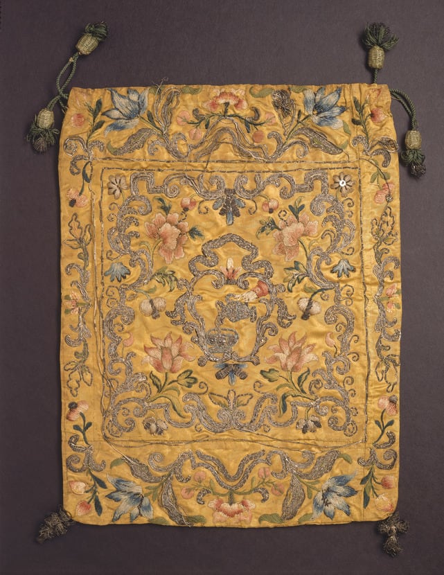 The donor of this bag descended from Jacob Levi, a Jewish banker who lived in Venice during the eighteenth century. The central emblem of a pouring laver and basin is the sign of the Levites, the servitors in the ancient Temple, who still wash the hands of Kohanim (descendants of the priests) before their blessing of the congregation. The laver and basin therefore symbolize the family name, Levi, and was used as a coat of arms.
