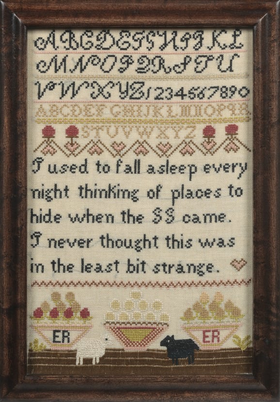 In this selection from the large-scale installation A Postcolonial Kinderhood, Elaine Reichek uses domestic objects to evoke memories of childhood and home. In her hand-embroidered samplers, she employs the craft of sewing while incorporating terse and sometimes humorous quotations that confront her complex Jewish identity. Reichek imbues this historically female practice with a critical voice that such articles of domesticity traditionally suppressed.