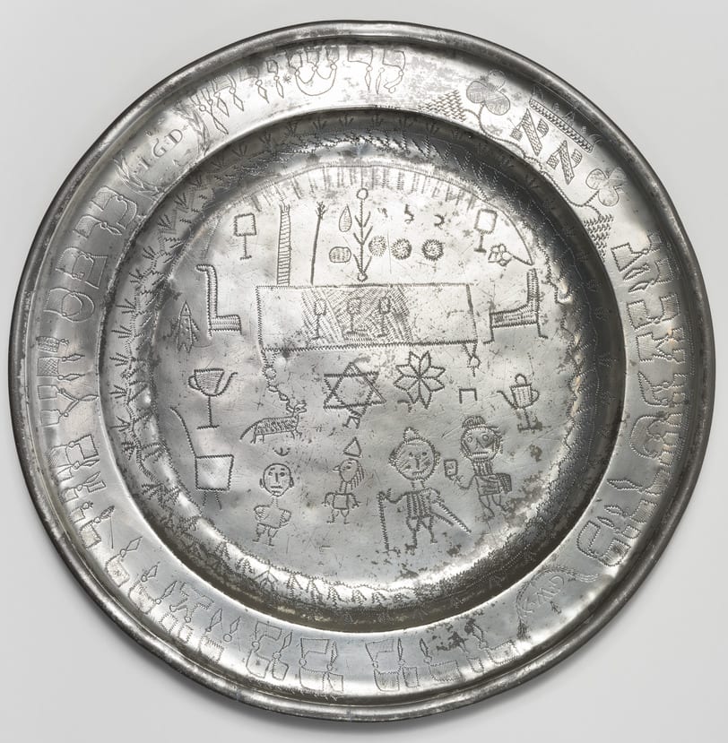 The engraving on this plate was executed by three different hands, probably at different times. Two sets of initials in Roman script on the rim identify the first owner. A Hebrew inscription in a good scribal hand around the rim was added later and includes Hebrew initials of another owner. The childlike Passover imagery in the center appears to have been added last.