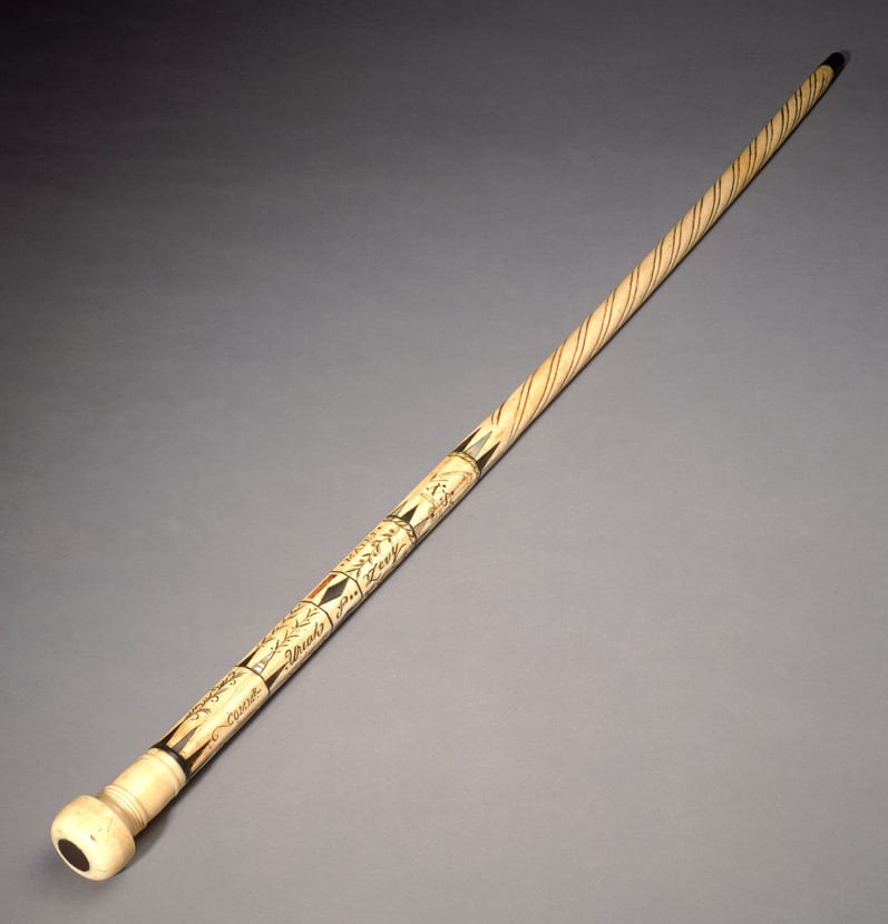 This scrimshawed cane was presented to Commander Uriah Phillips Levy, United States Navy, by the crew of his ship, the USS Macedonian. Levy was responsible for the abolition of corporal punishment in the Navy and for restoring Thomas Jefferson's home, Monticello.
