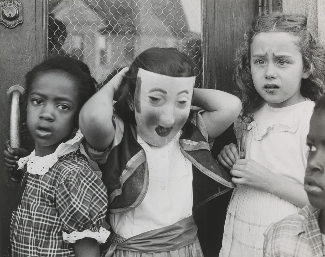 This eerie image of children on Halloween hints at racial tensions at the dawn of the civil-rights struggle. The effect is heightened by the tight cropping, the children’s anxious expressions, and the close juxtaposition of masked and unmasked faces.