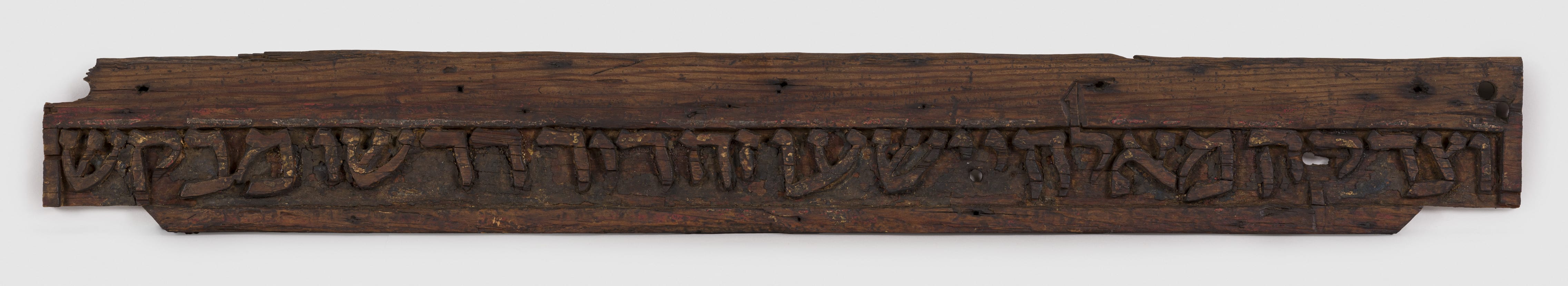 The framed carving reads: "...a just reward from God, His deliverer. Such is the generation of those who turn to Him." [Psalm 24:5-6] The small size of the panel and the reference to "a just reward," which can be translated "charity" in other contexts, suggest that this inscription once formed part of a cabinet for donations.