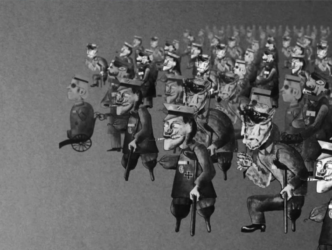 As the film progresses and the army of the wounded grows, the sound of their steps and their false limbs, crutches, and canes comes to resemble that of machine-gun fire. This is echoed in the installation by the noise of the vintage film projector. World War I brought mechanization and technology to warfare; the result was that soldiers suffered catastrophic injury and trauma. Artists were fascinated by this phenomenon, in particular the apparent merging of the human form with the mechanical, such as soldiers who returned with artificial limbs.