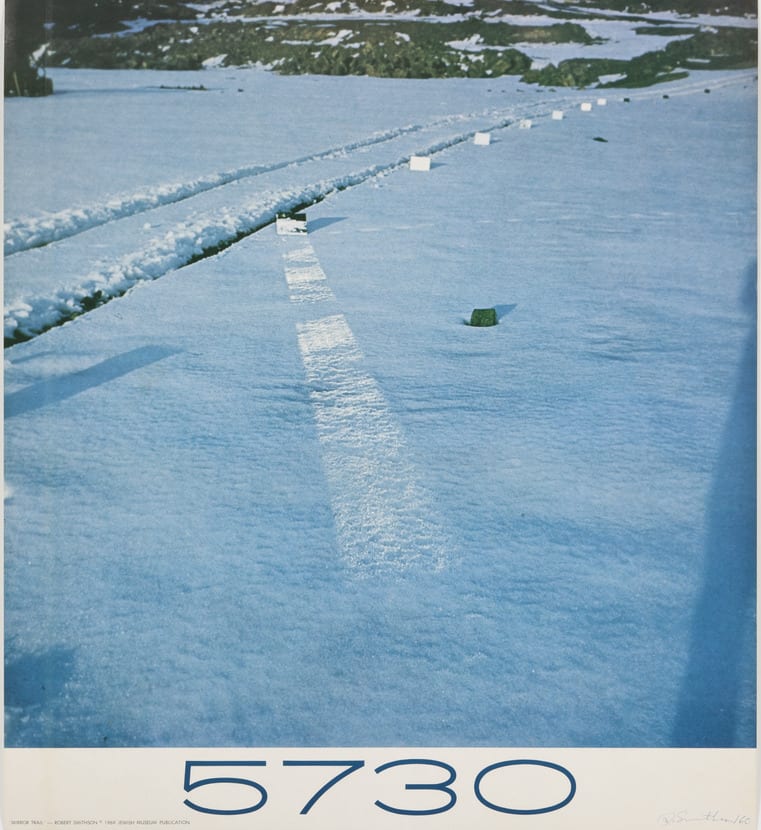Using the land as his medium, Robert Smithson was one of the most prominent earthworks artist, who employed elements of nature in situ or rearranged landscapes to create works that were subject to environmental natural changes. Most well-known for his Spiral Jetty , a site specific installation of rocks arranged in a spiral constructed on Utah's Salt Lake, Smithson unified this methodology with Jewish subject matter to create this graphic. Smithson photographed an interesting tract of land on the site of Mt. Moriah, traditionally considered the site where God created humans.