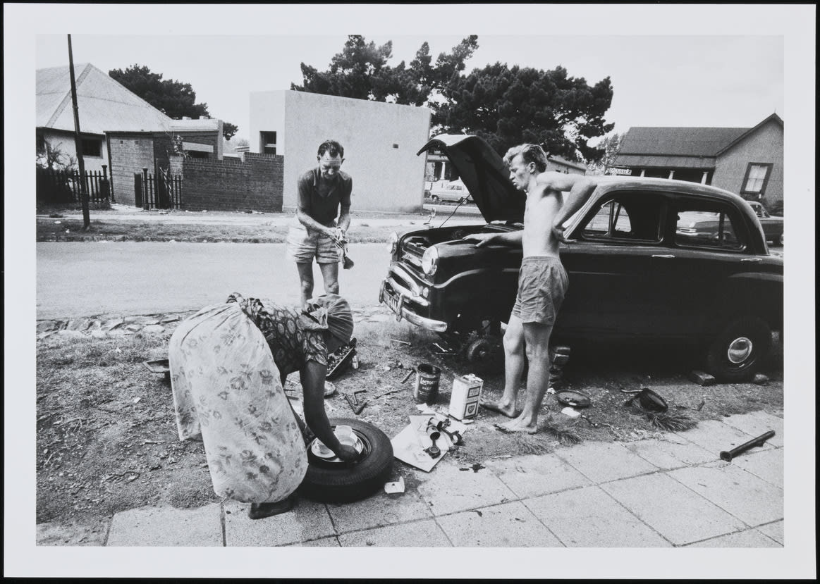 - Afternoon tea being served to two men repairing a car on a pavement in Fairview, Johannesburg, Transvaal (Gauteng)