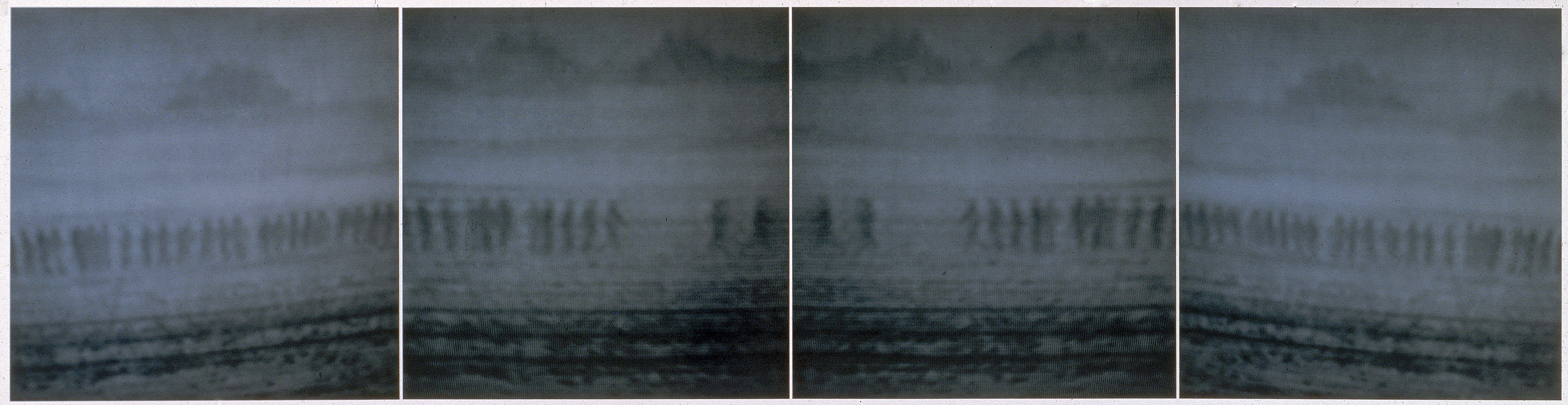 Throughout a career of more than three decades, Rovner, one of Israel’s foremost contemporary artists, has employed a great variety of media (from photography, video, and digital art to painting and sculpture) to explore the theme of human struggle. In the Decoy series (1991) she adapts radar and surveillance imagery, altering it to produce photographs of indistinct groups of people, seen as small, dark silhouettes. These scenes of blurred figures in unidentifiable locations have no specific narrative. “I’m known as “the artist who has these little people walking,” she notes. “Sometimes they’re like bacteria in petri dishes, sometimes covering the whole wall. The people are faceless, universal. But they are always real people, it’s never animation—I always start with reality. In anything I do, in everything I do, I always start from something real.”