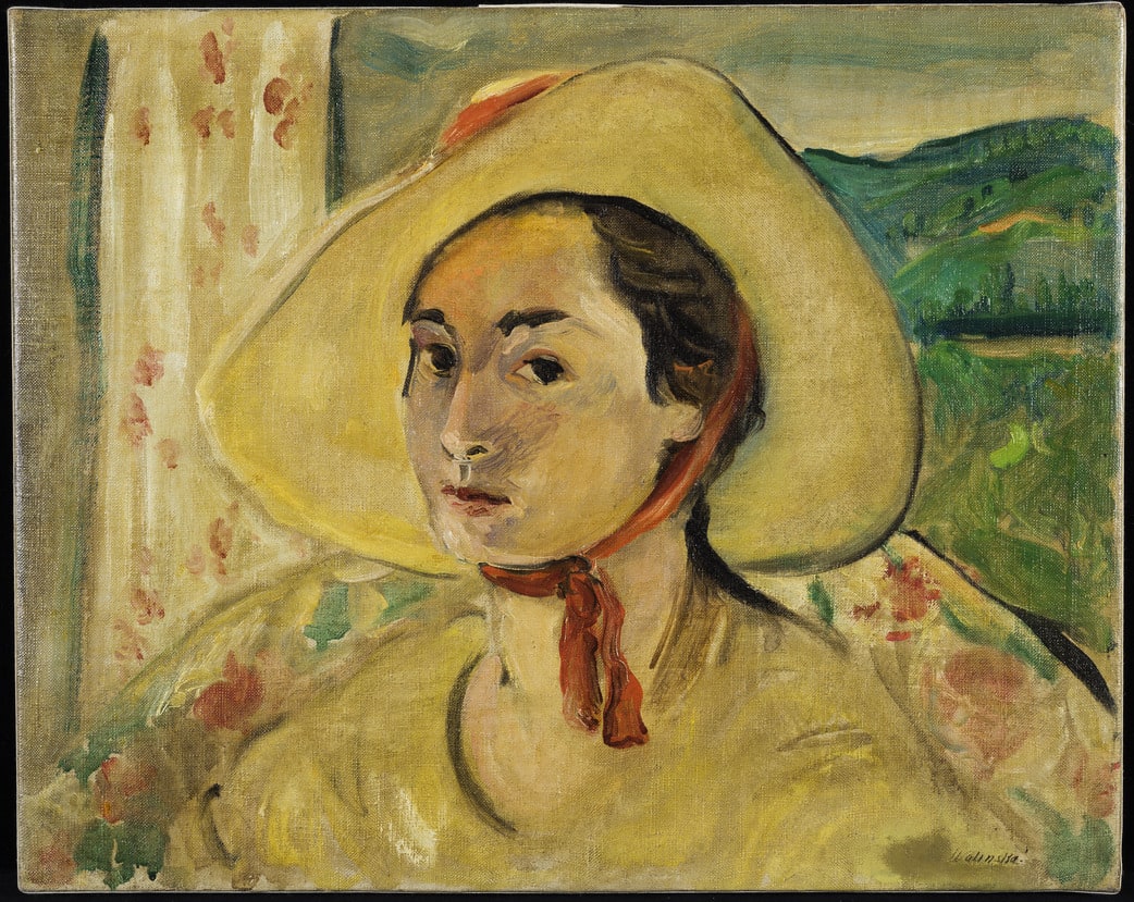 Showing herself in a moment of private reflection, the artist gazes directly at the viewer, reveling in the elegant and sensuous beauty of her own depiction. Warm, light tones dominate the canvas, suggestive of summer heat. A solid triangular composition contrasts with the artist’s spontaneous brushwork.