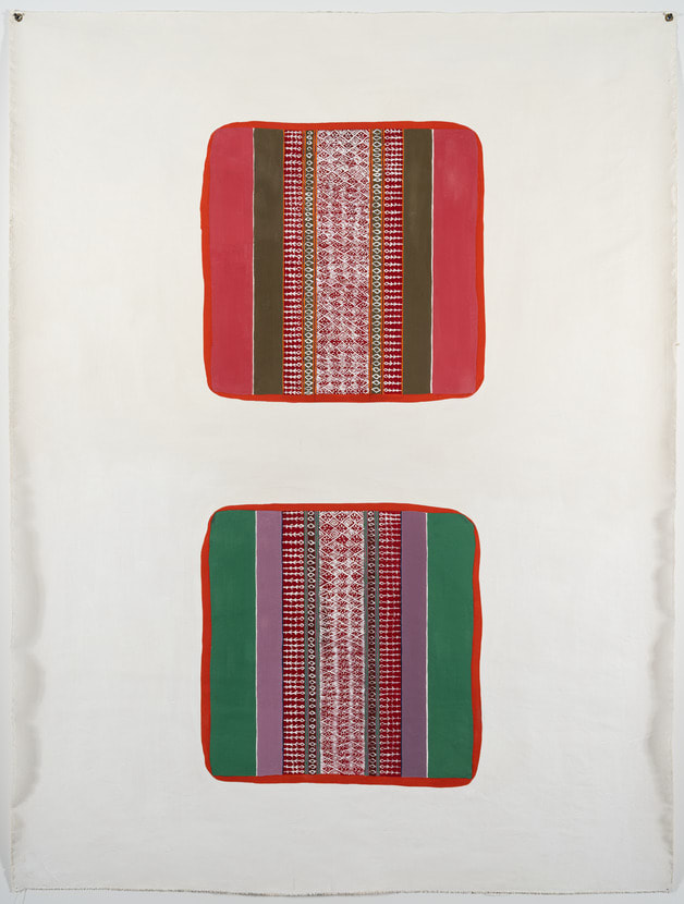 Amnon Ben-Ami questions the foundations of abstraction, implying that it does not preclude the depiction of recognizable objects. This painting is based on a pair of decorative pillows that the artist’s wife acquired while on vacation in Thailand. Flattened into two dimensions and compressed into two windowlike squares, the cushions become functionally abstract. The title of the work registers as a deadpan joke.