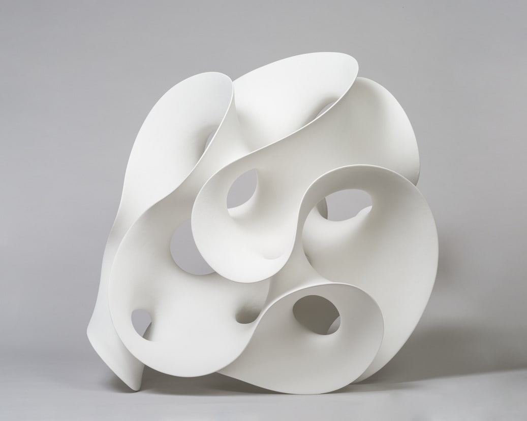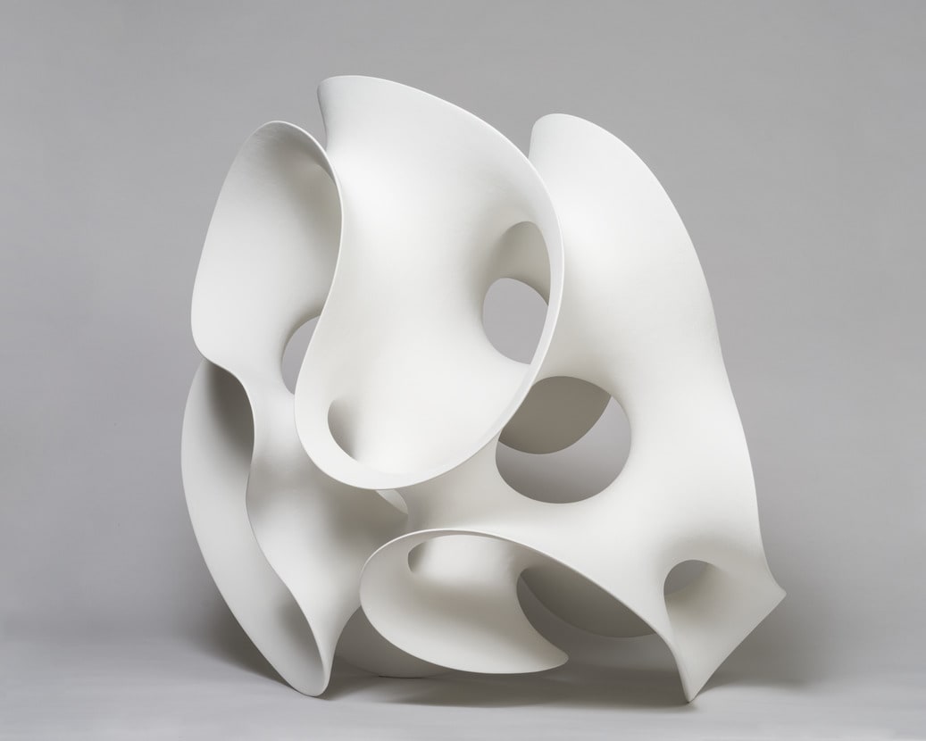 Eva Hild’s hand-built clay sculptures recall nature as it emerges in the mind’s eye and evoke psychological states. Made of white stoneware clay, WIND is coil-built, finely sanded, fired twice, and evenly coated in matte white paint. The artist’s process is slow, taking up to a year. The title of the work evokes its volumes of empty space as well as the curving planes of its surface. Like a seemingly endless Möbius strip, the planes of the sculpture flow into one another to make a single whole without inside or outside.