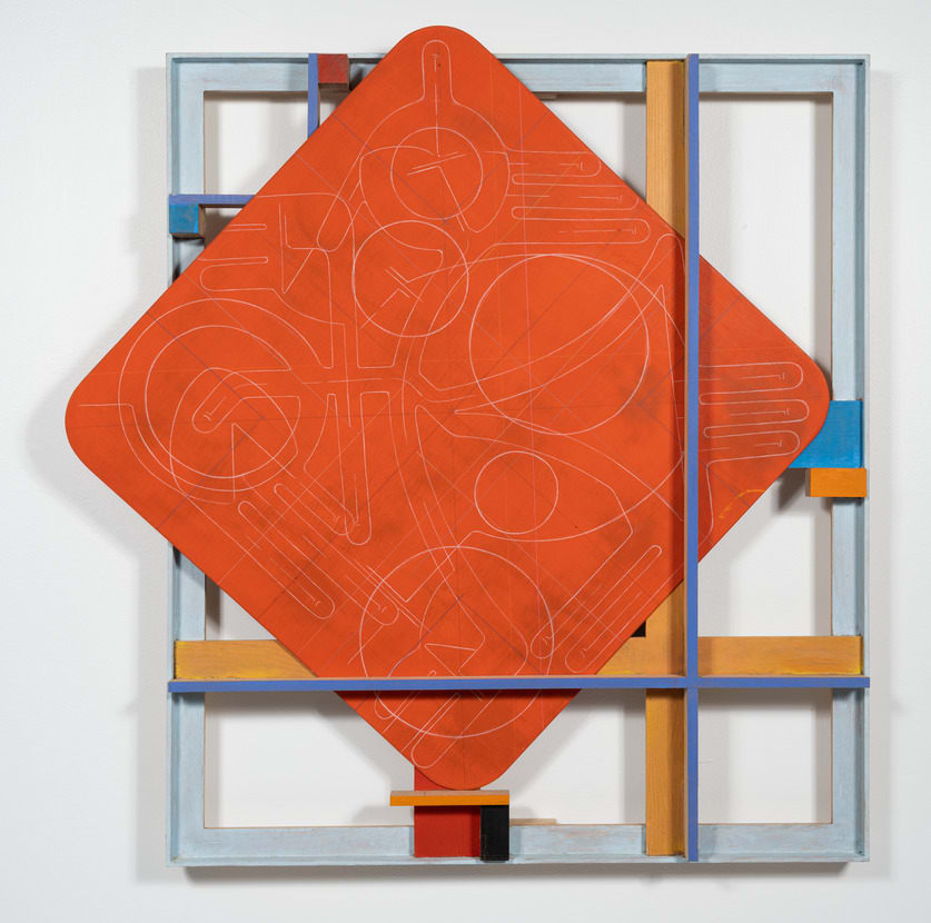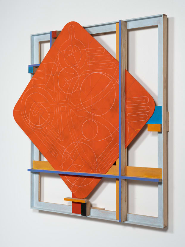 Lyght’s work often draws on architecture’s formal and material vocabularies. In works like this one, the plywood frame is equally structural and aesthetic. The diamond plaque in the center of the composition is snugly wedged among the bands of wood as if it were a kite about to blow away. The airy geometric abstractions that adorn this plaque echo the timehri, ancient rock paintings and drawings found in Guyana, where the artist was born.