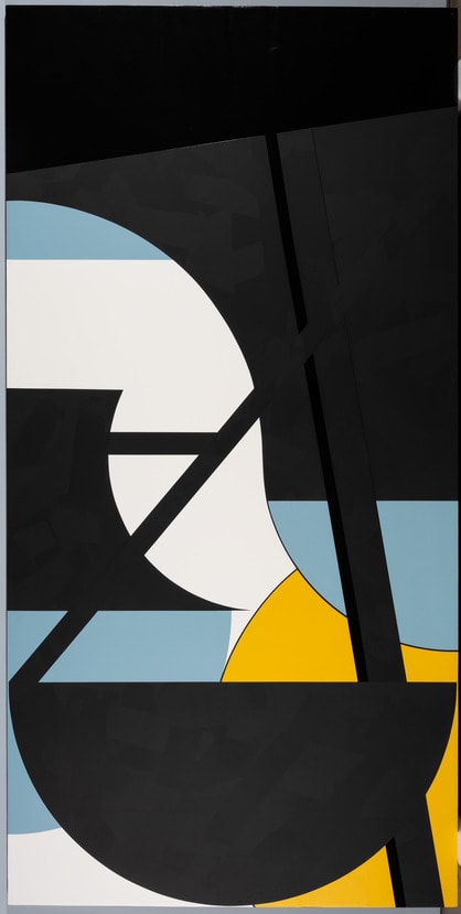 Serge Alain Nitegeka first started to make paintings to document his site-specific sculptural installations: angular and slightly menacing thickets of black plywood that ensnare crates and other sculptural elements as they ricochet off walls, ceilings, and floors. Using a stripped-down palette and recurring abstract and figurative forms, Nitegeka produces a stunning variety of visual and spatial objects. In this work, beamlike bands fragment the visual field and impede the movement of the viewer’s eye. These linear elements meet semicircles and crescents, which recall the moon, hulls of boats, and doors in architectural plans. For Nitegeka, whose family migrated across Africa as refugees when he was a child, this imagery and the overall sense of constraint evoke the myriad obstacles faced by displaced people around the world.