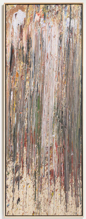 In 1969 Larry Poons was the youngest artist included in the influential New York Painting and Sculpture, 1940–1970 exhibition at the Metropolitan Museum of Art. In that show, established painters, including Barnett Newman, were presented alongside younger artists, “deflectors” who the curator Henry Geldzhaler argued were “redirecting” the trajectory of art. Poons’s art at the time was based on the grid and on rule-based operations that removed the artist from the process of making the work. Soon after, he took a very different direction. In works such as Refugo, Poons luxuriated in the material properties of paint, throwing, pouring, dripping, and building it up all over the canvas.