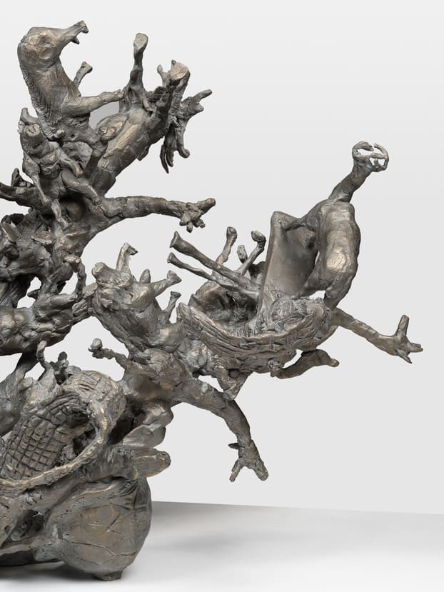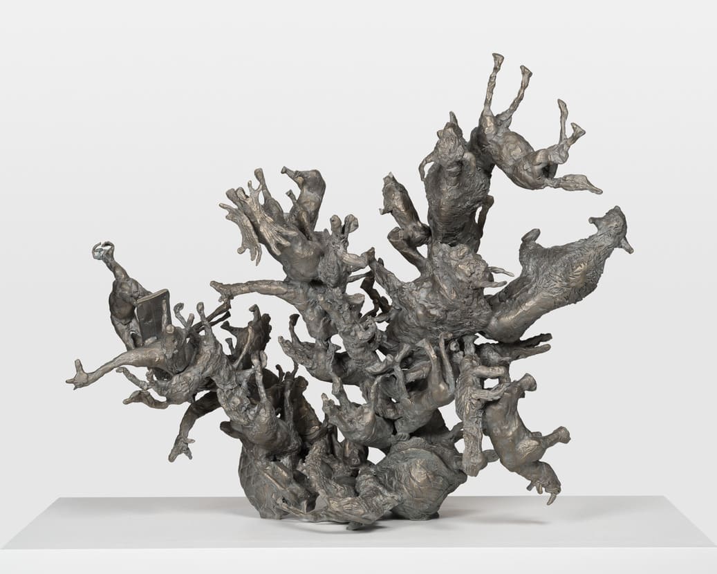 Nancy Rubins is known for large-scale public sculptures, including Agrifolia Majoris (2017), which she installed in Chicago, on the shores of Lake Michigan in 2022. In Diversifolia #1, a smaller-scaled work related to Agrifolia Majoris, animals of all types are flung into the air, with legs, tails, horns, and antlers splayed in every direction.