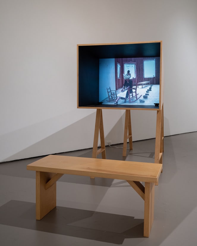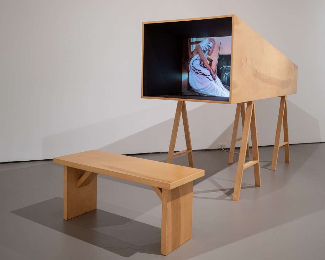 - Single-channel video, color, sound (approximately 10 min.), custom-designed wooden theater box, screen, media player, wooden trestle, speakers, and bench
