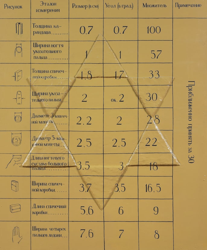 from the underground art movement in the late 1970s. This painting is about measuring, charting, and quantifying, but the precise scientific meaning of the tables is of less consequence than the whole represented by the Star of David. Implicitly confrontational yet partly concealed, the star is a metaphor for the emergence of Jews from near invisibility within the Soviet Union and at the same time a reference to its use by the Nazis as an antisemitic device.