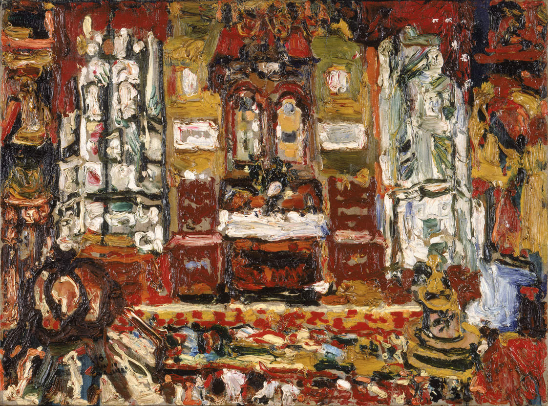 The ornateness of Interieur Baroque reflects the sumptuous lifestyle of the wealthy, land-owning family into which Cavaglieri was born. The artist specialized in paintings of luxurious interiors filled with costly furnishings, objects of art, and elegantly dressed women. In a perfect merging of subject and technique, his impastoed application of the paint directly from the tube onto the canvas heightens the tactility of privileged comfort.