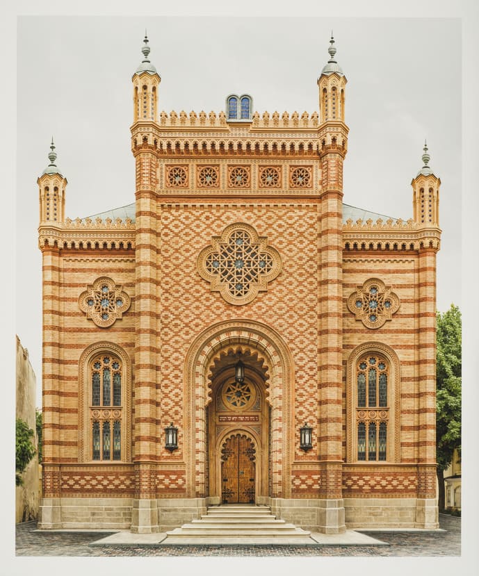 This composite view is of the Choral Synagogue in Bucharest, one of the only synagogues active in Romania today. It was constructed between 1864 and 1866 to serve a then- robust Jewish community of Bucharest, the majority of whom were killed or fled during World War II. The Moorish Revival-style building survived the war and even the Romanian dictator Nicolae Ceauşescu’s plans for its demolition in the 1980s. Its design is nearly identical to that of the Synagogue Tempelgasse in Vienna, which was completely destroyed on Kristallnacht, a Nazi pogrom that took place on November 9 and 10, 1938.