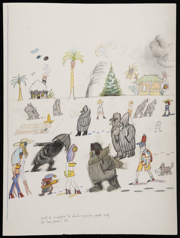 - Graphite, colored pencil, ink, and crayon on paper