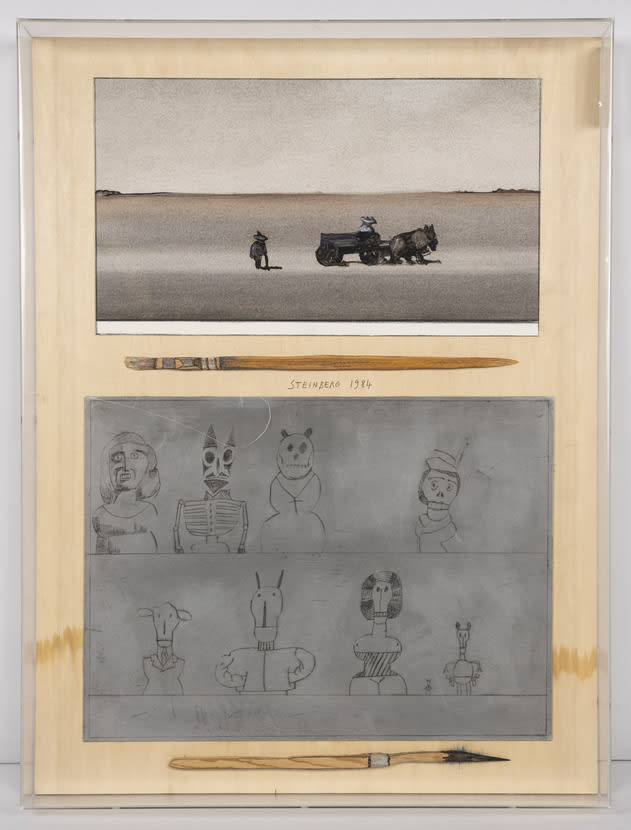- Watercolor, oil and colored pencil on paper, gouache and colored pencil on wood, and incised and inked sheet metal mounted on wood