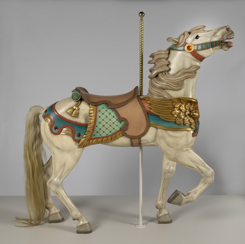 Charles Carmel trained in wood carving as a young man in his native Russia. He was steeped in the Eastern European Jewish tradition of carving intricate wooden Torah arks, replete with lions, deer, eagles, and other emblematic animals. This magnificent white horse was created by Carmel—by the early twentieth century a renowned carver of carousel horses in the United States—in what was later known as the Coney Island style. The highly naturalistic rendering of the horse is characteristic of Carmel, whose steeds were strong and aggressive with windswept manes, open mouths, and batwing saddles. The artist settled in Brooklyn and soon began applying his skills to the crafting of carousel horses at various workshops.