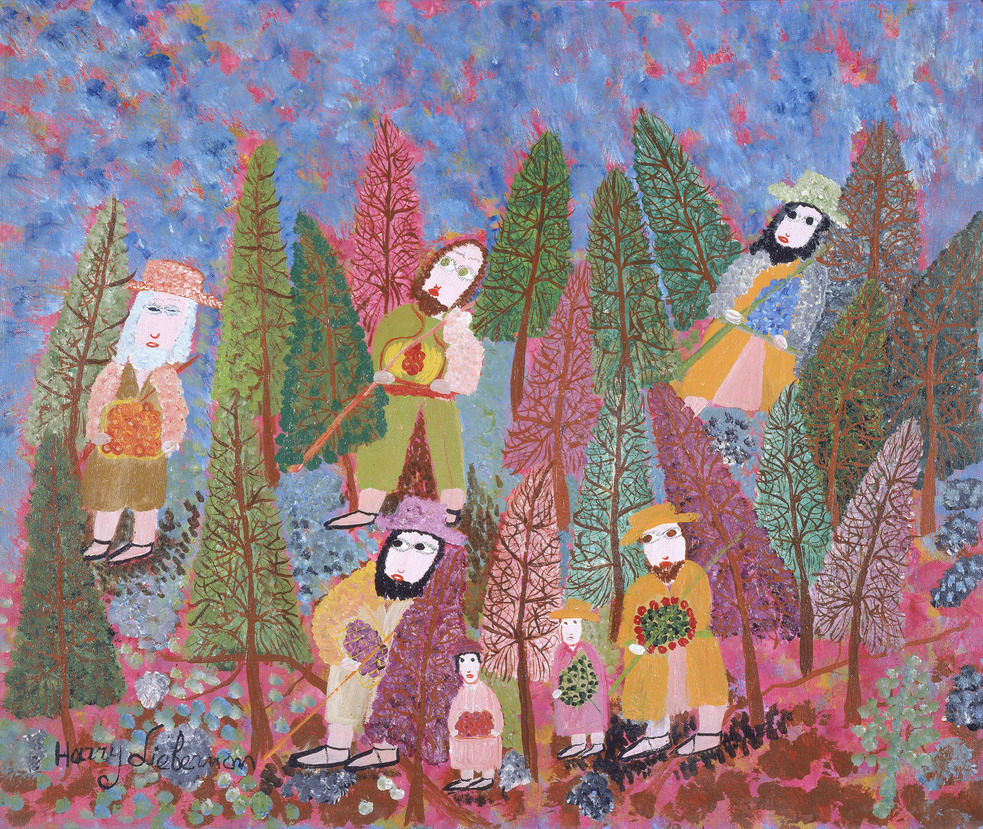 The painting Shavuot-The Harvest represents the festival that marked the beginning of the wheat harvest and commemorates the bringing of offerings to the Temple in Jerusalem and the giving of the Torah at Sinai. Attesting to Lieberman's Hasidic heritage, the work is filled with Kabbalistic symbolism such as the triangular form of the trees that denote the ten sefirot, or emanations, emerging from God.