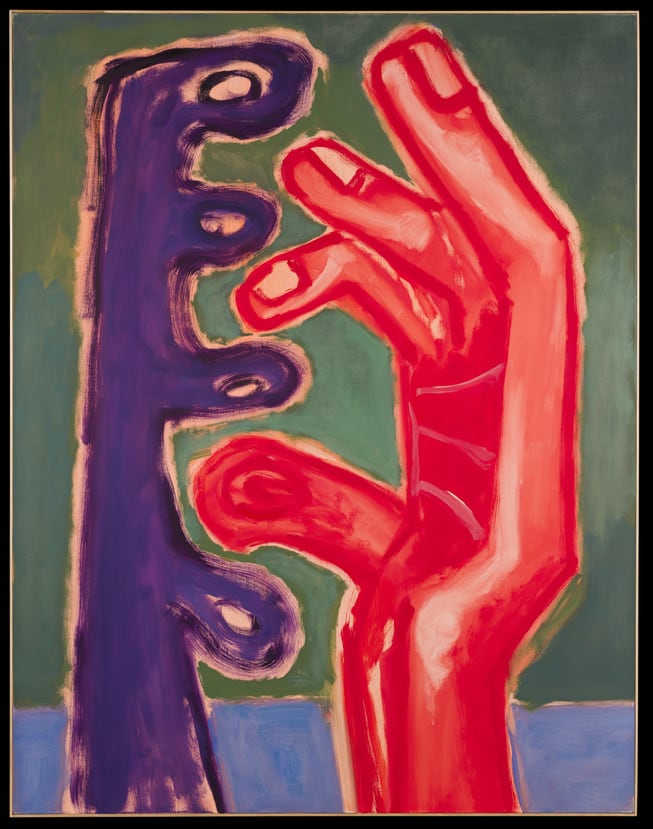 Ansel Krut is a London-based painter best known for his expressive compositions and grotesque forms, which draw from both from art history and his upbringing in apartheid-era South Africa. Born to a Jewish family who fled Eastern Europe prior to World War II and settled in a tight-knit diasporic community in Cape Town, Krut creates visceral works that suggest the vivid colors and dramatic landscapes of his hometown while gesturing at the complex status of his position as a white settler—which he calls his "confused cultural identity"—in a society marked by apartheid, colonialism, and totalitarianism. His gestural renderings of suspended body parts, still lifes, and architectural scenes are imbued with a type of psychedelic absurdity, their joy nonetheless qualified by undertones of existential melancholy. His largescale 2017 canvas Red Hand, Violet Hand is charged with a type of raw immediacy, in which abstraction and figuration function as both formal experiment and coded social commentary.