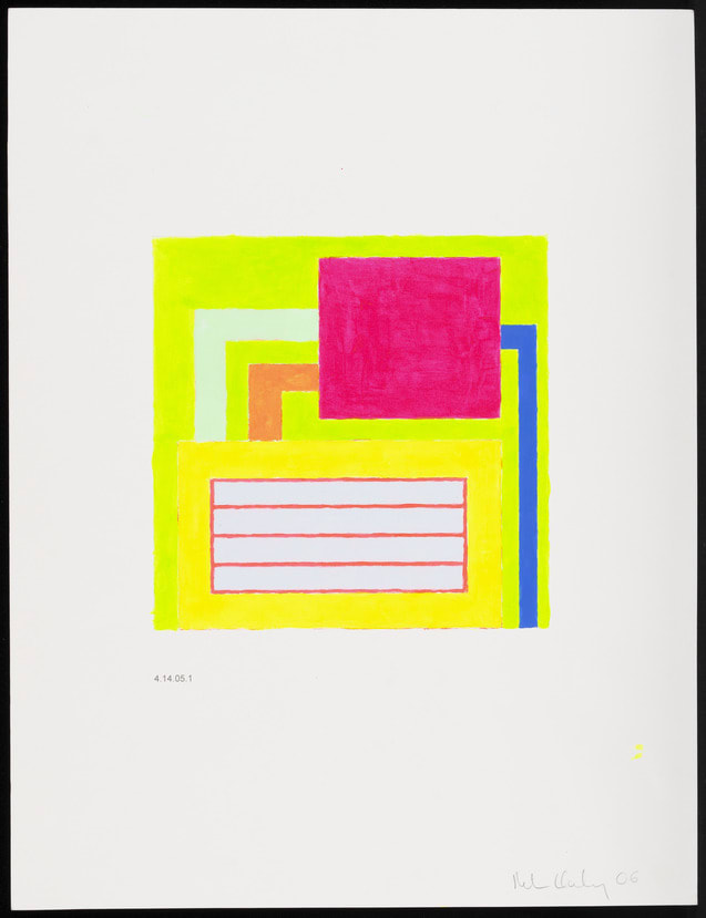 Peter Halley examines how the spaces we inhabit control movement and produce meaning. His paintings combine three basic visual elements—what the artist calls “prisons,” “conduits,” and “cells”—in brilliant colors. He works out each composition in a digital drawing program and then produces a small-scale study, examples of which are on view here. The work is next translated to a large-scale, textural painting on canvas. Halley’s rigid, repetitive forms suggest machinery or the harsh fluorescent lights of a prison cell.