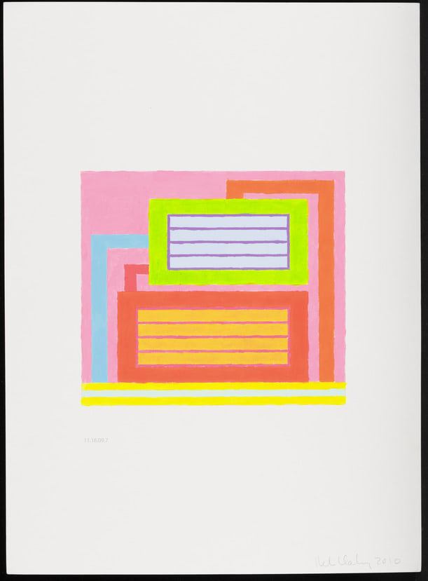 Peter Halley examines how the spaces we inhabit control movement and produce meaning. His paintings combine three basic visual elements—what the artist calls “prisons,” “conduits,” and “cells”—in brilliant colors. He works out each composition in a digital drawing program and then produces a small-scale study, examples of which are on view here. The work is next translated to a large-scale, textural painting on canvas. Halley’s rigid, repetitive forms suggest machinery or the harsh fluorescent lights of a prison cell.