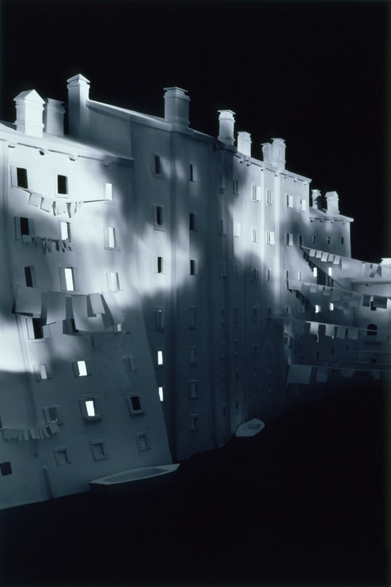 In the photograph Venice Ghetto, stark white tenement buildings draped with clotheslines stand out from a black sky and the dark waters of the Venetian canals at night. Lights in only a few of the windows and two small boats docked against the buildings emphasize the emptiness of the nighttime scene. While the scene of Venice's stone buildings and canals may evoke nostalgia for the charm of Old Europe, the photograph's title alludes to the city's darker past. The Venice ghetto was established in 1516, when a Jewish settlement was set aside, shutting its occupants off from the rest of the city. Although no longer a restricted area, the Venice ghetto evokes historical Jewish subjugation and is a reminder of the Venetian origin of the word "ghetto." In Casebere's photograph, the eerie shadows enveloping the buildings hint at this area's somber history.