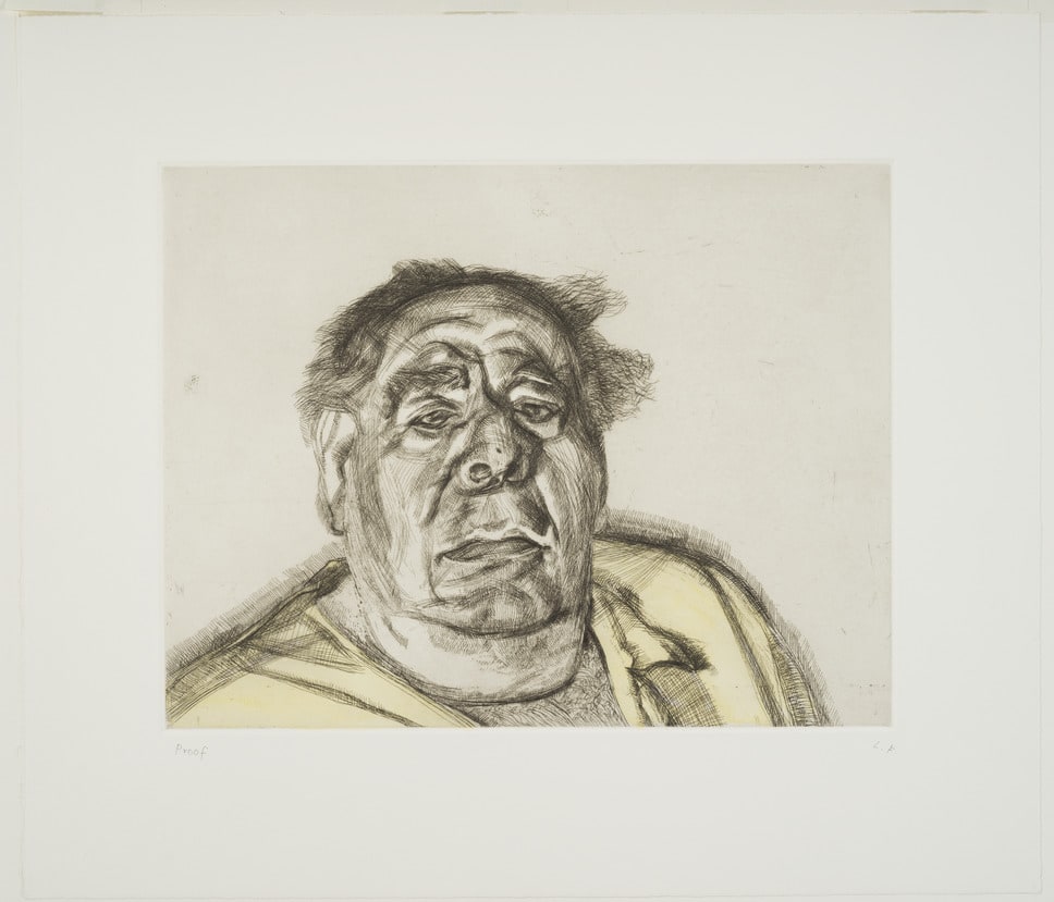 As painter and draughtsman, Lucian Freud focused on the human figure earning a reputation as a master in the realist tradition. Emphasizing Lord Goodman’s massive neck and head, crosshatched with intricate lines and viewed from below, the artist projects his subject’s strength and vulnerability.
