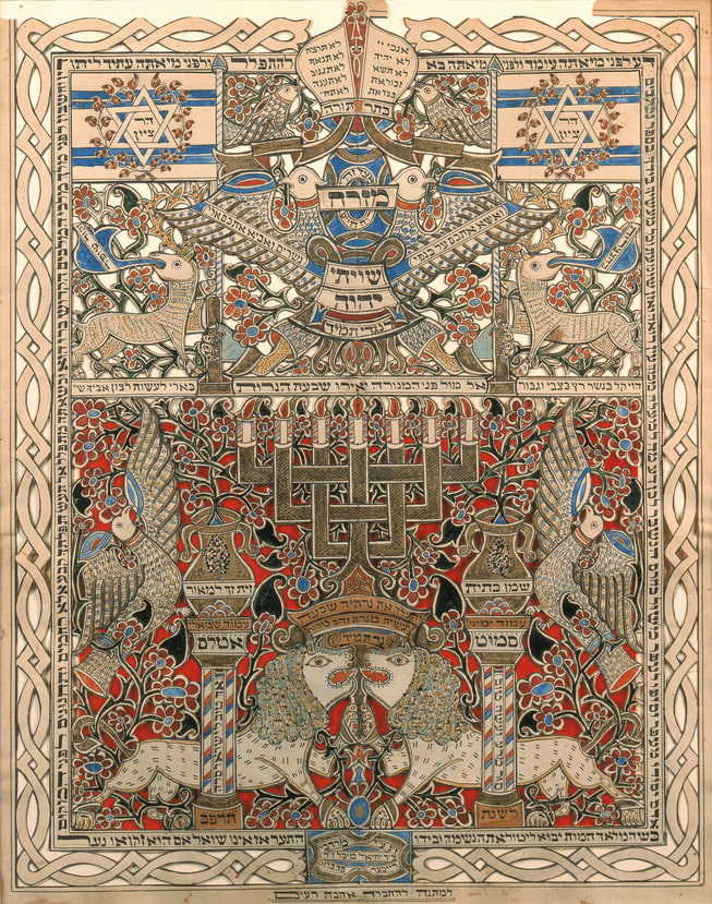 As attested by its Hebrew inscriptions this papercut served two functions. In the upper section a double-headed eagle encloses the word "mizrah," Hebrew for east, indicating that the papercut was meant to be used as a decoration for the eastern wall of a home or synagogue to mark the direction of prayer. At the juncture of the eagle's wing the inscription "I am ever mindful of the Lord's presence" (Psalms 16:9) indicates that the piece functioned also as a shiviti, a composition intended to inspire worshippers to adopt a proper attitude toward prayer. Usually hung on a synagogue wall, the shiviti derives its name from the first Hebrew word in that biblical passage. Framing the entire piece, the papercut also includes three passages from the "Ethics of the Fathers." The elaborative decoration includes Zionist and traditional symbols such as the flags in the upper corners, the crown of Torah inscribed with the Ten Commandments above center, and the seven branched candelabrum in the lower half. The inscription at the bottom center indicates that this work was a gift to a fraternal society.