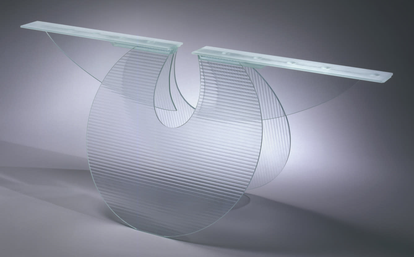 This lamp was originally a glass sculpture, which Weinrib adapted into a Hanukkah lamp at the request of the museum. The artist comments, "The concerns of transparency, translucency, linearity, and weightlessness are elements I have been involved with for many years in my sculpture."