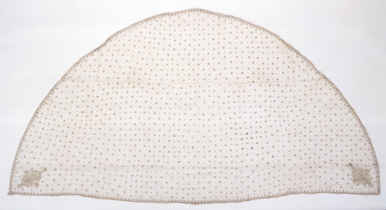 The composition of the veil, a continuous border decoration along the edge and a floral spray emerging diagonally from each one of its corners is typical of many Islamic textiles, for example, those from the Ottoman Empire. Gold-embroidered tulle was particularly used for wedding garments in Persia and represented a portion of the wealth that belonged to the bride.