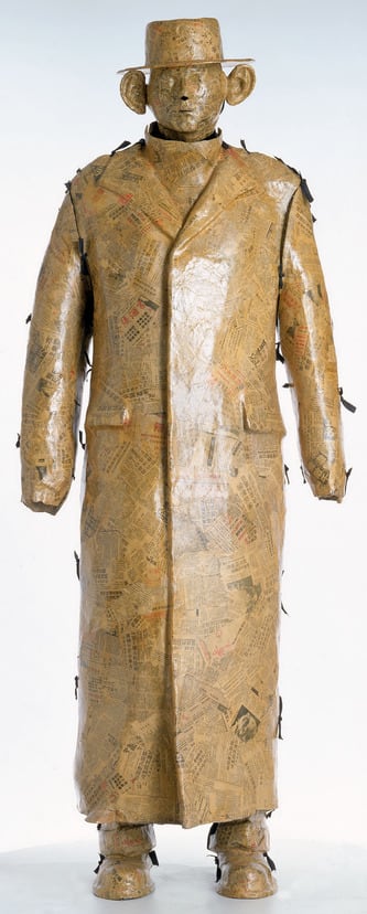 The Golem is at once a sculpture, a costume, and a set design. This is not out of the ordinary for the objects that Robert Wilson uses in his theater productions. His intention is that they not be mere decorations but rather works of art in their own right. Most of Wilson's sculptural works to date are based on theater designs, props, and furniture. The Golem is a life-size papier-mâché sculpture made from Chinese and Japanese newspapers and was worn by an actor playing that character in Wilson's 1987 production entitled Death, Destruction, and Detroit II at the Schaubühne in Berlin. The golem appeared onstage, enclosed in the stiff hat and overcoat that was held together at the back with laces. Another character, possibly a rabbi, dressed in typical Eastern European Jewish garb, cut the lacings and removed the costume to reveal the actor-as-golem inside wearing the same (but this time real) hat and overcoat.