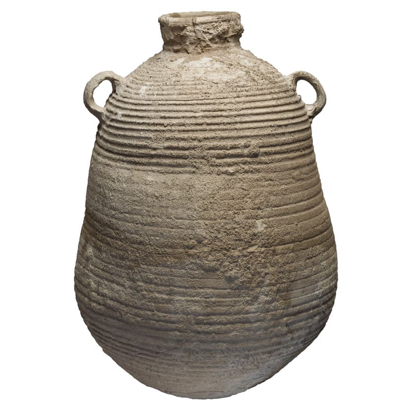 This ribbed jar with broad bottom is the local storage jar of Roman Period Israel. It was used for storing wine, oil, grains, fruits, and even perfume, as is known from an inscription on a 1st century B.C.E. jar. A representation of a serving table, carved on a table top found in the Jerusalem vicinity, depicts large jars under the table, probably containing wine or other ingredients for a banquet.