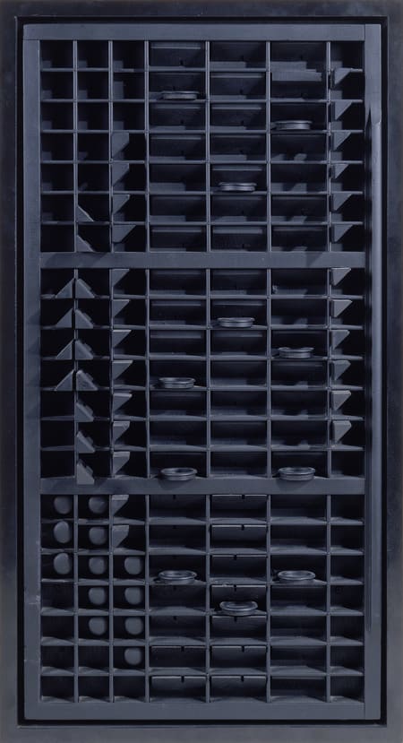 Renowned sculptor Louise Nevelson started as a social realist painter, training with Theresa Bernstein and Diego Rivera. She confronted sexism early in her career when a critic was appalled that her work was made by a woman. In the 1950s, Nevelson joined the National Association of Women Artists and soon found her métier in abstract sculpture. Applying paint-most famously black, but also white and gold-to found wooden objects, she pieced together room-size constructions evoking social situations. In the 1970s, Nevelson identified with radical women's groups like Ti-Grace Atkinson's The Feminists and simplified her system of shadow boxes and painterly illusionism, proclaiming, "I am a woman's liberation." At The Jewish Museum, Nevelson's work has been shown in nine group shows and was featured in a retrospective in 2007.