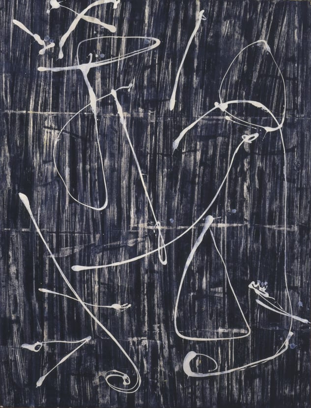 In the Charred Journal series, Morris Louis evokes the specter of Nazi book burning. The blackened background of Louis's series of seven paintings is reminiscent of burnt paper, from which rise white letters, numbers, symbols, and agitated swirls. Deploying these abstracted forms, he affirms the notion prevalent in the postwar period that abstraction was the only valid approach to represent the horrors of war.