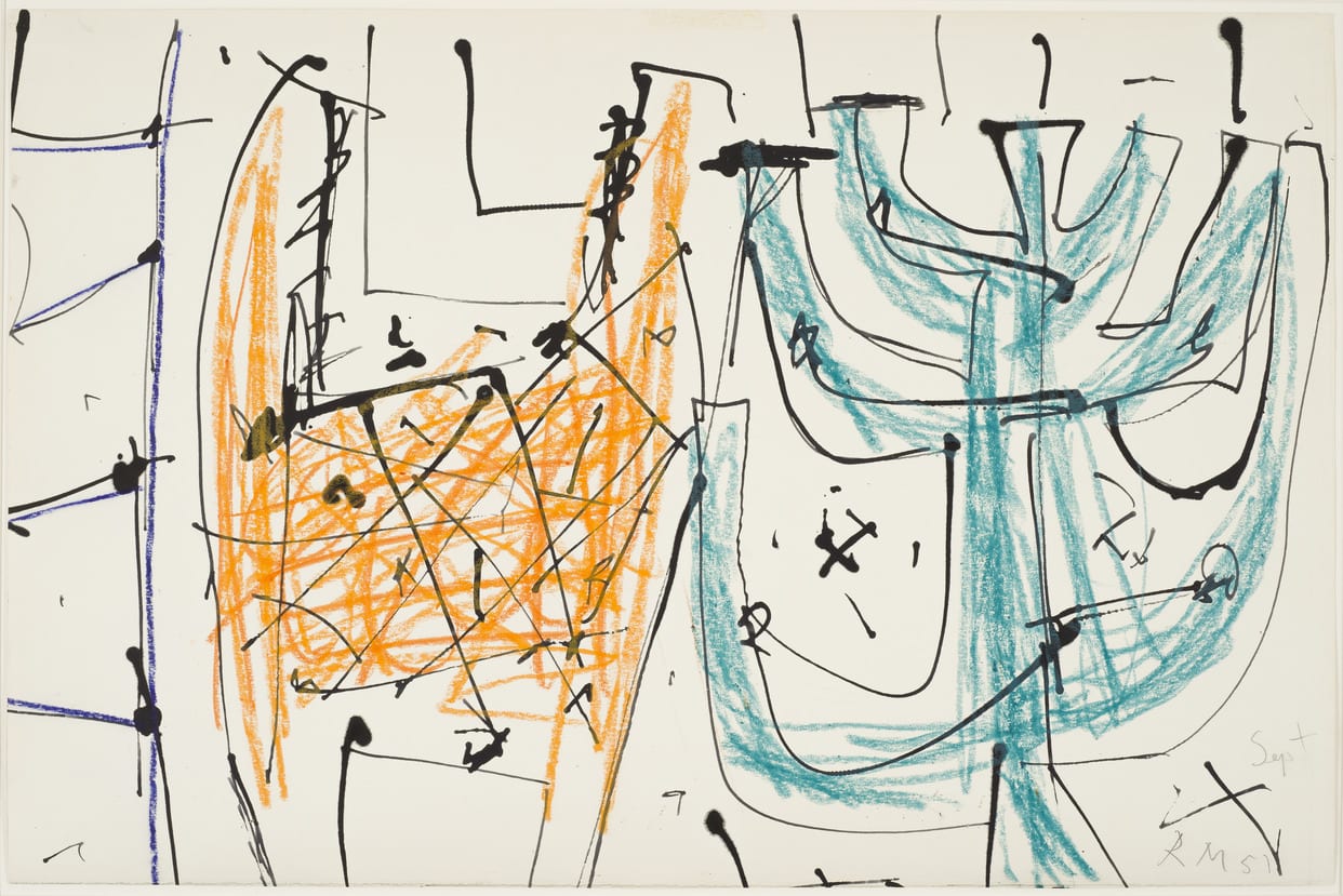 In 1950 architect Percival Goodman asked the painter Robert Motherwell to create a mural for the entry hall of Congregation B'nai Israel in Millburn, NJ. This preparatory study shows abstracted Jewish symbols which Motherwell incorporated into his final design.