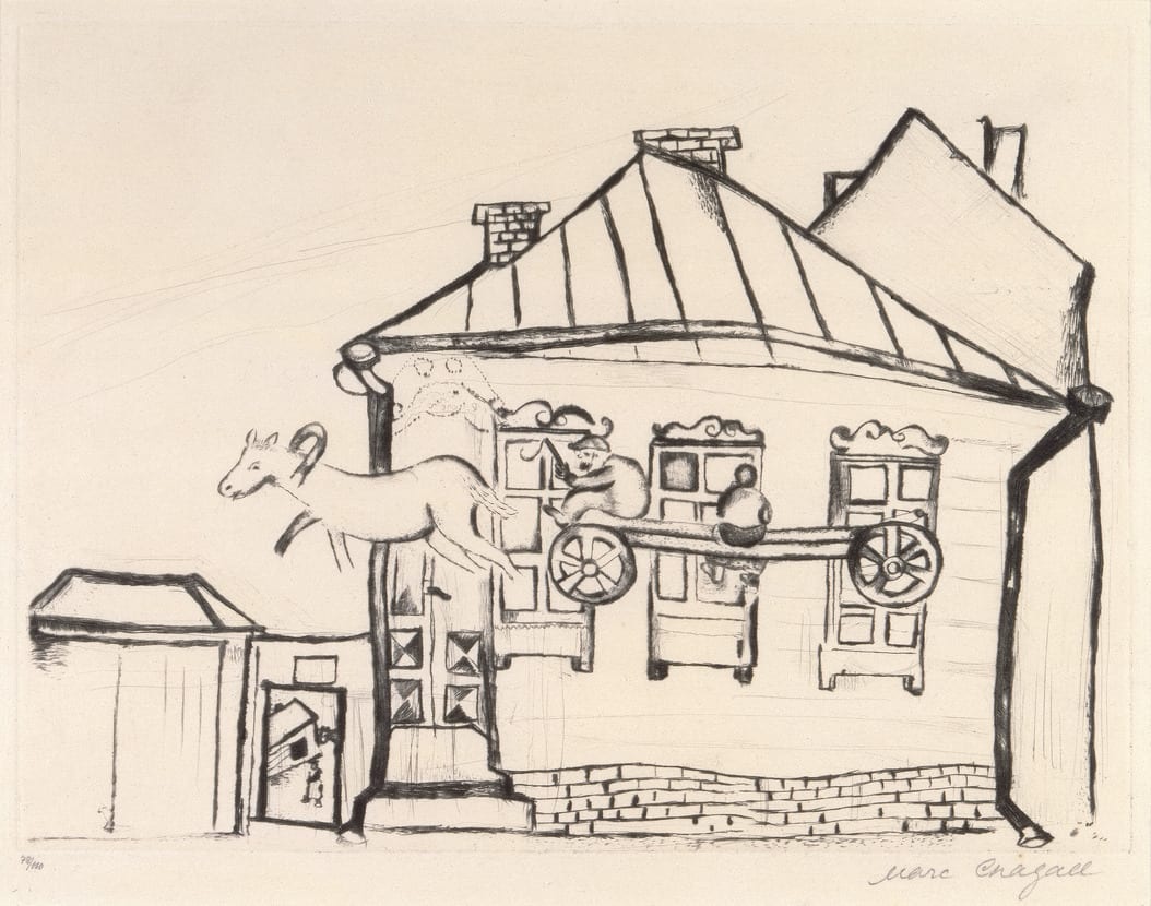 Marc Chagall's folkloric depictions of his home, Vitebsk, have become archetypes of East European shtetl imagery. The twenty etchings illustrating his autobiography represent the artist's first attempts at printmaking. After studying the process in Berlin with Hermann Struck, Chagall executed these works within a few weeks.