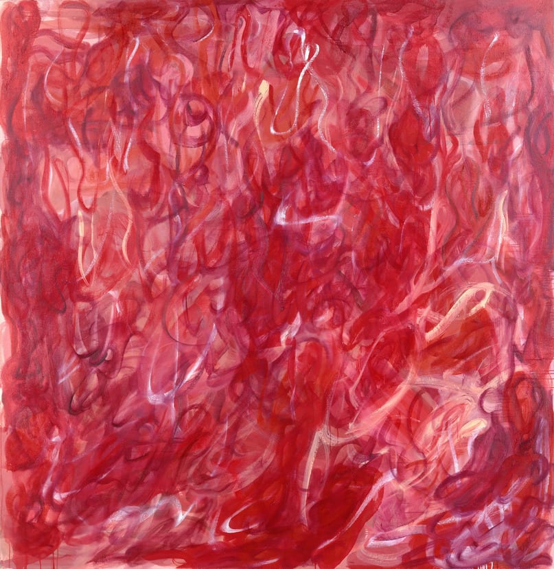 Melissa Meyer's paintings are characterized by elongated, curvaceous brushstrokes. In Lilith, the lattice of red and orange swirls honors an exemplar of female independence. In Jewish legend, Lilith was created at the same time as Adam, but left the Garden of Eden when she refused to be subservient to him, and became associated with demonic powers. Jewish feminists consider Lilith a heroine, and a long-running magazine bears her name. Meyer coauthored the influential essay on "femmage," or women's collage, with Miriam Schapiro, published in Heresies in 1977. Lilith has been previously displayed in the permanent exhibition of The Jewish Museum.