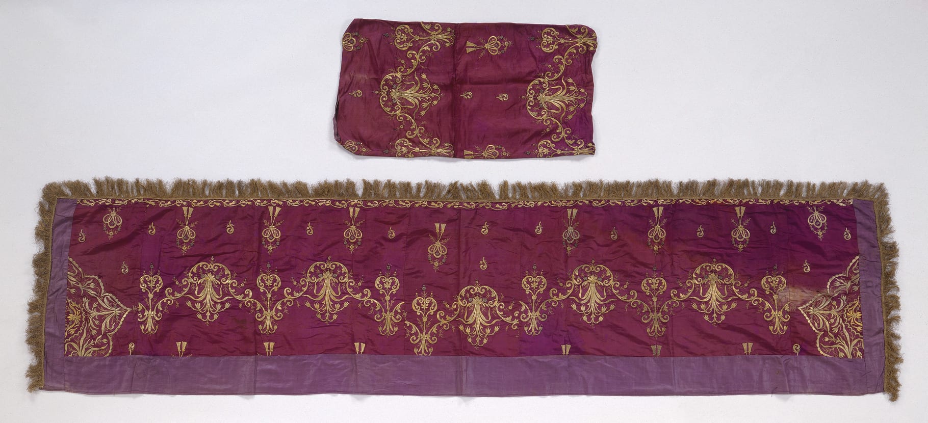 The gold embroidery that marks these textiles generally signifies ceremonial use and may indicate that the covers were used on special occasions like holidays. The gold on light purple silk is typical of the embroidery of other Greek communities like Ioannina. The lightness of the motifs and their ornamental arrangement indicate a late date.