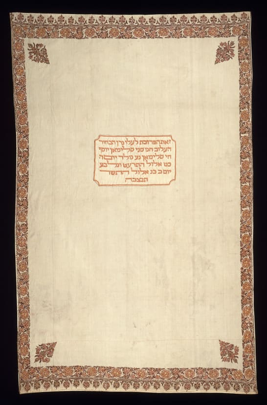 This Torah ark curtain once hung in the Maghen David Synagogue of Calcutta. It bears a dedicatory inscription in memory of Sonny Solomon, a Flying Officer in the Royal Air Force during World War II, and a member of the Baghdadi community of Calcutta. The twenty-five year-old Solomon was the only Jew from the community to perish in combat, during air operations over France in 1944.