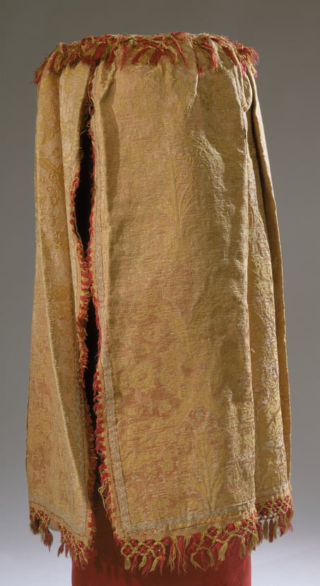 - Silk brocade; silk fringe; parchment and ink