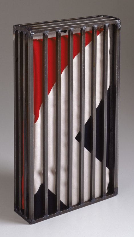 I feel that much of my work has evolved from my personal experiences as a Jewish woman born during World War II. Caged History is the most overt comment on Jewish history in my body of work... The flag was captured by my uncle, Paul Davis, in the fall of 1944 during the battle and fall of Metz, France. His Battalion, the 95th Infantry, was under the direction of General Patton. After the battle of Metz, this group of men became known as the Iron Men of Metz.